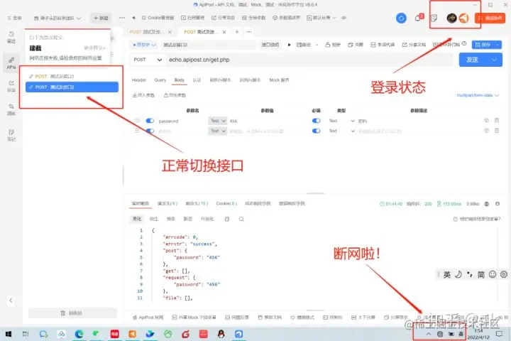 断网,登录状态下,可以正常切换当前项目下的接口。