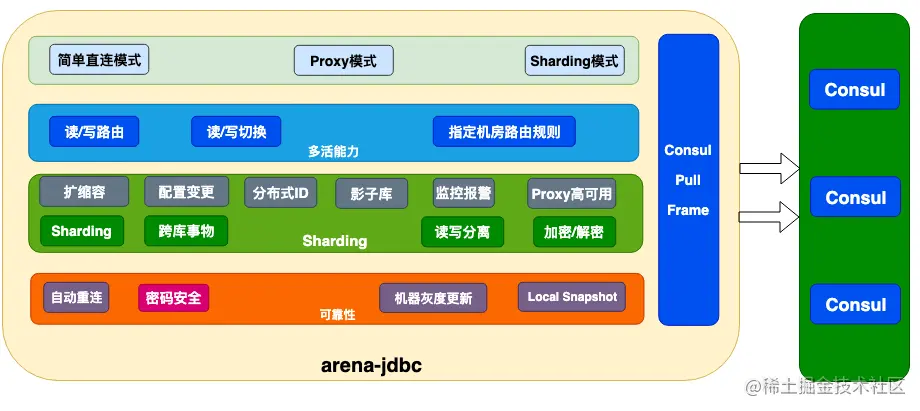 Arena-Jdbc 层的能力基本是基于 Apache ShardingSphere 的能力建设,我们只是基于喜马拉雅需要的特性做了增强和优化,整体架构如下: