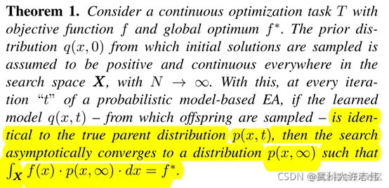定理1。考虑一个目标函数为f且全局最优的连续优化任务T。在搜索空间X中,从其采样初始解的先验分布q(x,0)在任何地方都被假定为正且连续的,N → ∞。这样,在基于概率模型的进化算法的每次迭代“t”中,如果子代被采样的学习模型q(x,t)与真正的父代分布p(x,t)相同,则搜索渐近收敛于分布p(x,∩) [40] Q. Zhang and H. Muhlenbein, “On the convergence of a class of estimation of distribution algorithms,” IEEE Transactions on evolutionary computation, vol. 8, no. 2, pp. 127–136, 2004