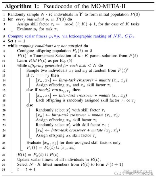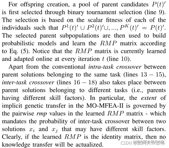 - 在MO-MFEA模型中,属于不同任务的亲本解决方案之间的任务间交叉过程中,知识传递的主要方式是隐性遗传传递。从本质上讲,遗传传递的程度是由一个定义为随机交配概率(rmp)的用户定义的固定标量传递参数决定的。关于MO-MFEA的更多细节,请参阅[14]。
