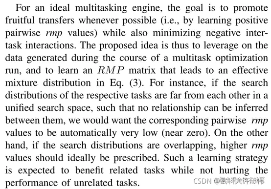 对于一个理想的多任务引擎,其目标是尽可能促进有效的传输(例如,通过学习成对的正rmp值),同时最小化负的任务间交互。提出的想法是利用多任务优化运行过程中生成的数据,和学习一个RM P矩阵导致一个有效的混合分布Eq。(3)。例如,如果搜索分布相互远离的各自的任务在一个统一的搜索空间,因此,不能推断出它们之间的关系,我们希望相应的成对RMP值自动地非常低(接近于零)。另一方面,如果搜索分布重叠,理想情况下应该指定更高的rmp值。这种学习策略期望在不影响不相关任务的表现的同时,使相关任务受益。