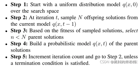 为了进行这一学习,我们借鉴了现有的基于概率模型的搜索算法的理论。这些算法通过迭代建立父解的概率模型来指导优化搜索,然后通过对这些模型进行采样来生成新的子代。典型的步骤可以总结如下。