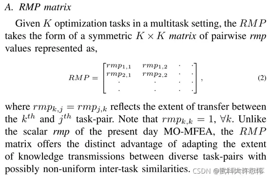 - 利用RMP矩阵代替标量rmp,有效地跨两个以上的任务进行多任务处理,任务间的关系可能各不相同。例如,给定三个不同的优化任务,第一个和第二个任务之间的相似度可能不同于第一个和第三个任务之间的相似度。因此,对所有任务对使用相同的rmp值被认为限制太多。