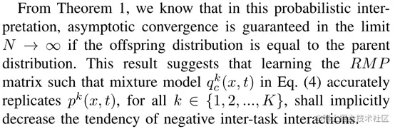 - 由定理1可知,在这种概率解释中,如果子代分布等于父分布,则保证在N→∞极限下渐近收敛。这一结果表明,对RM P矩阵的学习使Eq.(4)中的混合模型qk c(x, t)准确地复制了pk(x, t),对于所有k∈{1,2,…, K},会隐性地减少任务间负向交互作用的倾向。(意思就是通过调整RMP矩阵使得迁移后的分布尽可能和原来的子代分布接近~)