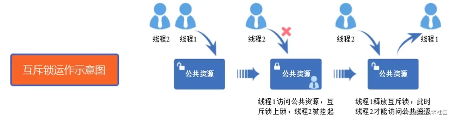 - 当一个互斥锁为加锁状态时,此时其他任务如果想访问这个公共资源则会被阻塞,直到互斥锁被持有该锁的任务释放后,其他任务才能重新访问该公共资源,此时互斥锁再次上锁,如此确保同一时刻只有一个任务正在访问这个公共资源,保证了公共资源操作的完整性。