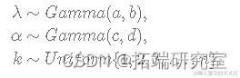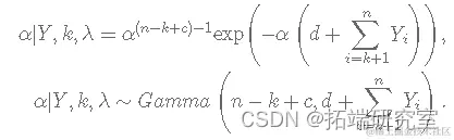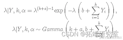 正如我之前提到的,Gibbs 采样器的实现需要从目标分布的边缘分布中采样,因此我们需要找到 λ、α 和 k 的完整条件分布。你怎么能这样做?简单来说,您必须从上面介绍的连接分布中选择仅依赖于感兴趣参数的项并忽略其余项。