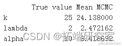 从结果中,我们可以得出结论,使用 R 中的 Gibbs 采样器获得的具有变点的指数分布对参数 k、λ 和 α 的估计值的平均值接近于参数的实际值,但是我们期望更好估计。这可能是由于选择了链的初始值或选择了 λ 和 α的先验分布。