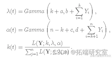 现在,对于算法的每次迭代,我们需要生成 λ(t)、α(t) 和 k(t),如下所示(记住如果 k+1>n 没有变化点):