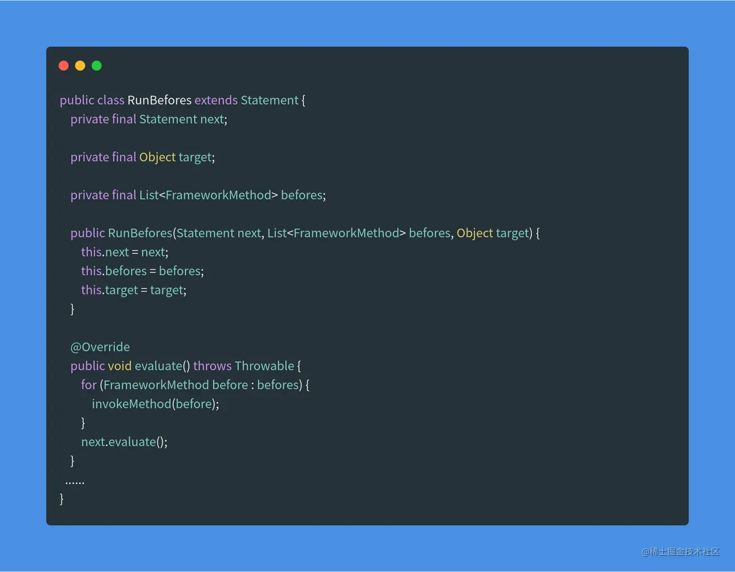 我们来看这个RunBefores类是如何实现来保证具有BeforeClass注解的方法先于Test注解的方法执行的。