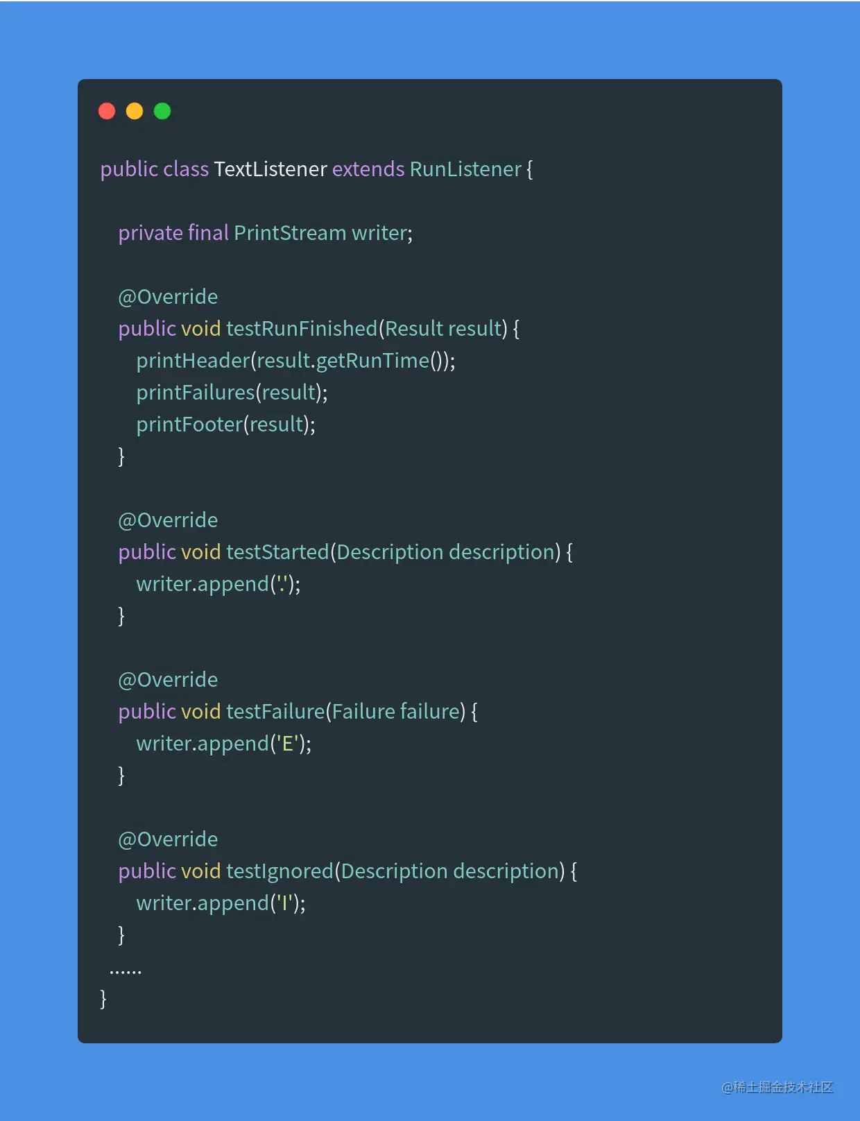 使用观察者模式的作用就是解耦测试的执行与测试结果的展示。我们来看一下JUnit具体是怎么做的。
