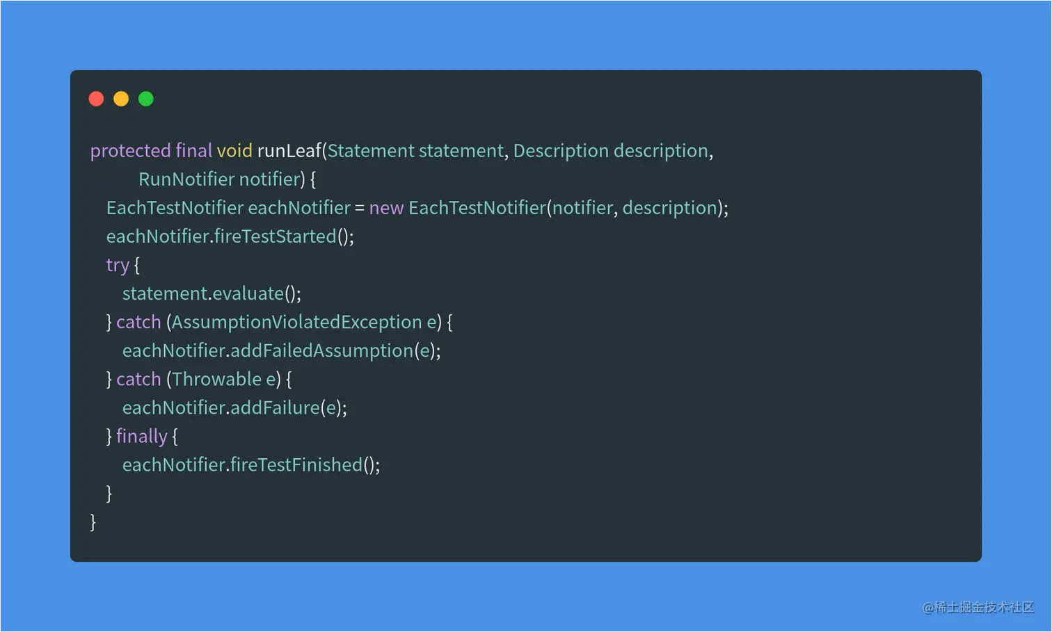 这里相当于对statement执行的开始、结束和报错阶段进行了监听,调用了不同的方法。而这些方法,最终委托到了注册到TestNotifier的TestListener了。比如addFailure方法,最终调用的是TestListener的testFailure方法。