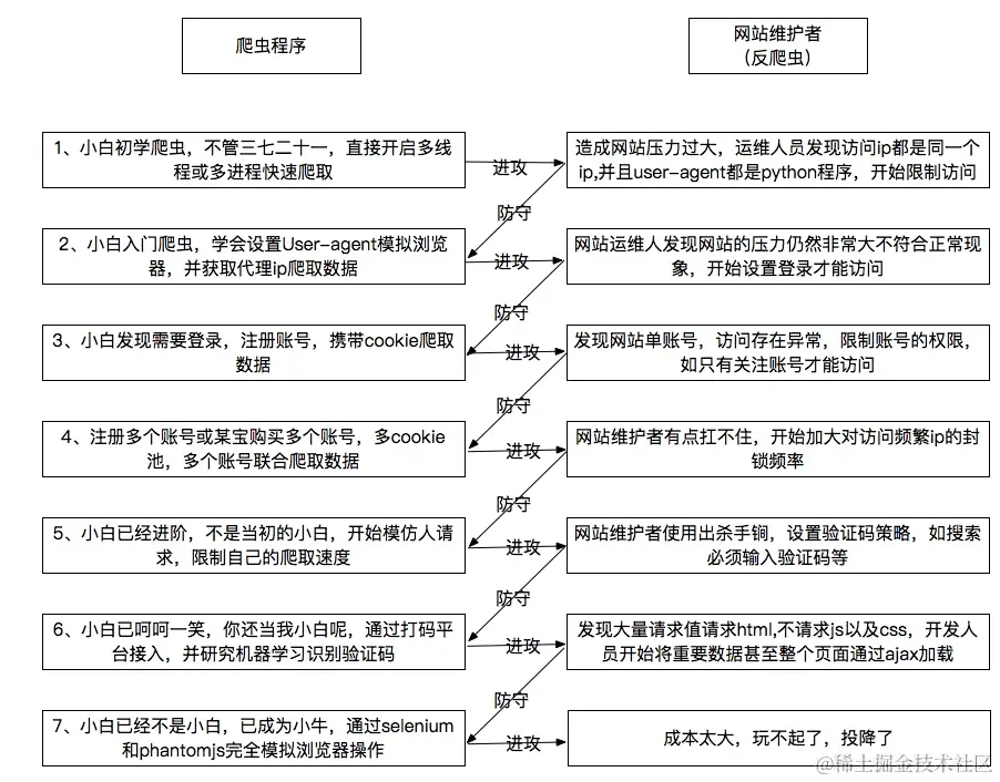 在实际开发中,为了应对网站的反爬虫机制,我们还需要掌握更多的技能,比如用户代理,IP代理,cookie账号登录,网页抓包分析等,下面是一个大神总结的爬虫和反爬虫之间你来我往的较量机制: