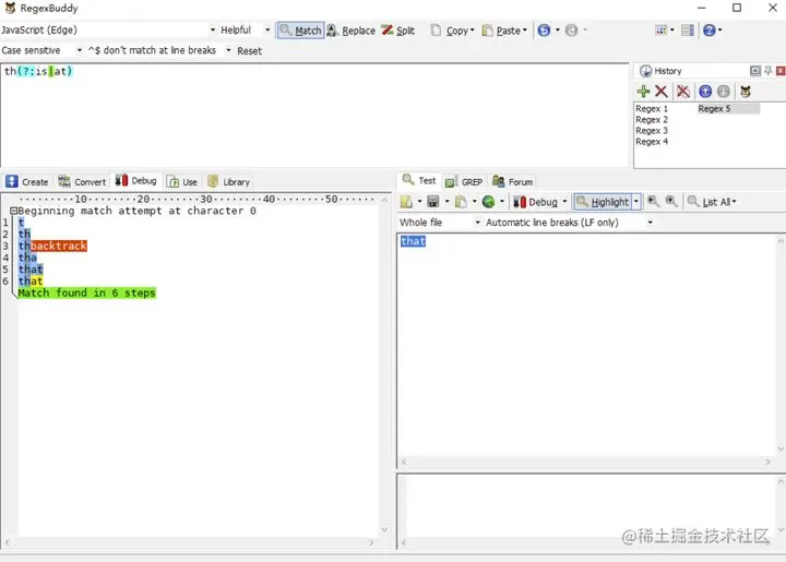 有人可能认为以上没啥区别,实践出真知,让我们用以上两个正则表达式去匹配一下 that。