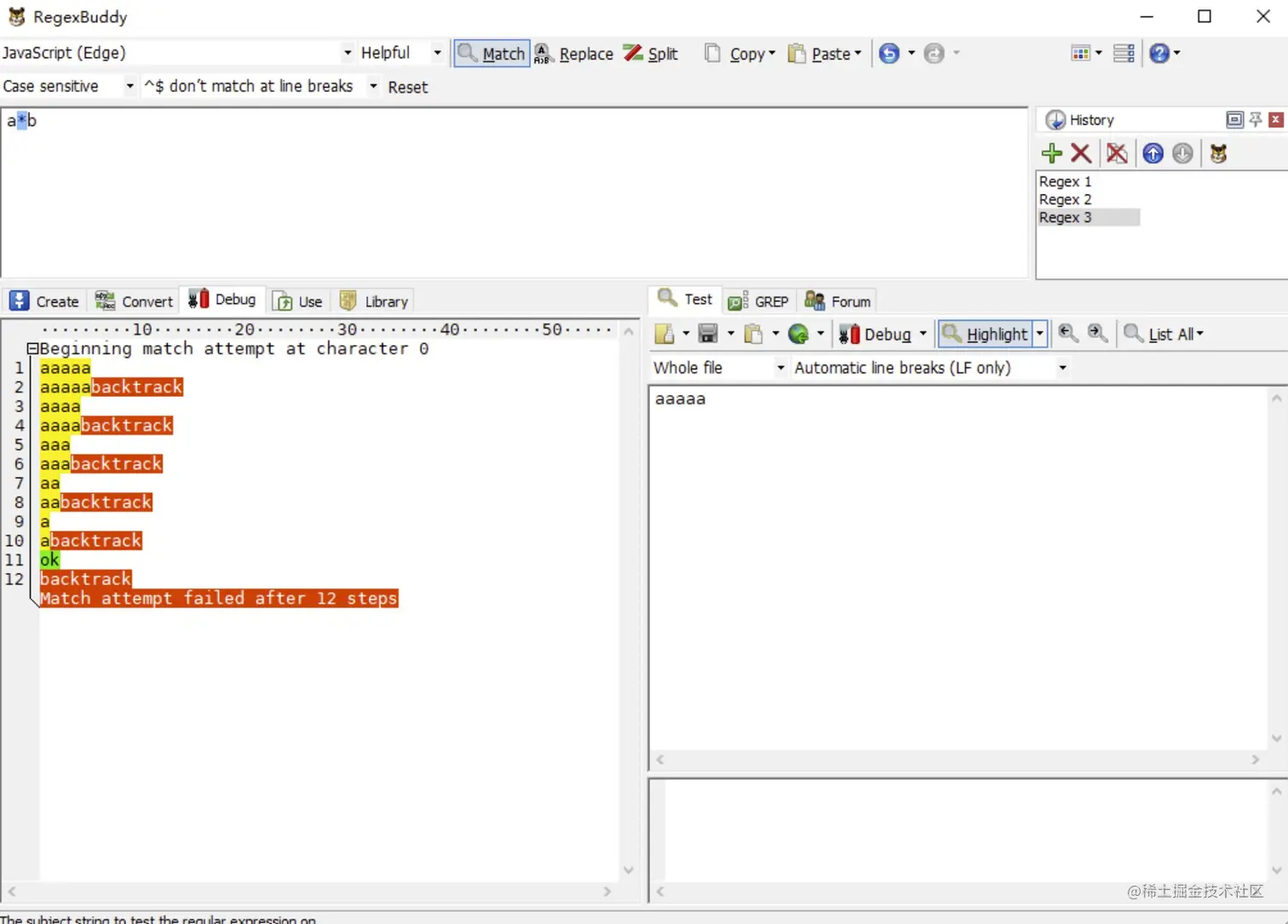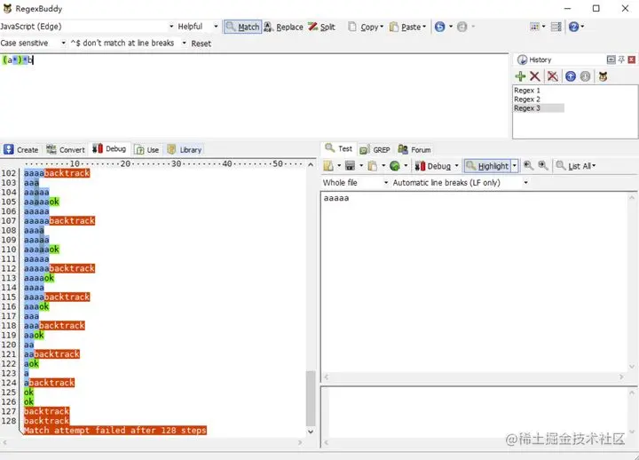 我们使用正则表达式/a*b/去匹配字符串 aaaaa,看下图 RegexBuddy 的执行过程: