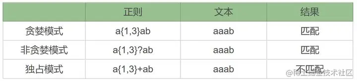 如果你用 a{1,3}+ab 去匹配 aaab 字符串,a{1,3}+ 会把前面三个 a 都用掉,并且不会回溯,这样字符串中内容只剩下 b 了,导致正则中加号后面的 a 匹配不到符合要求的内容,匹配失败。如果是贪婪模式 a{1,3} 或非贪婪模式 a{1,3}? 都可以匹配上。