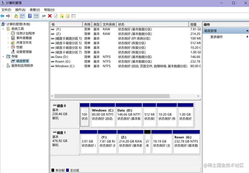 打开资源管理器,在此电脑上右键选择管理,点击磁盘管理,可看到如下界面: 在你想要分配用于安装系统的磁盘空间上右键,点击删除卷后该磁盘区域就会变成空闲状态,如果要利用该硬盘的其他空间就要自己新建卷。所以只需要分配好合适大小的空闲磁盘区域即可。