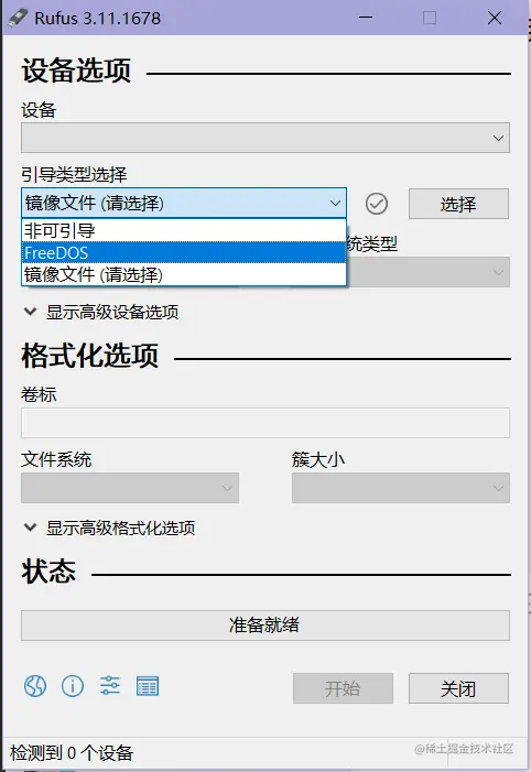 制作启动盘 需要一个U盘,U盘中不要有重要的文件,因为制作启动盘需要进行格式化。使用rufus可以将下载完的镜像文件制作成启动盘。 在设备中选择要制作成启动盘的U盘设备,引导类型选择FreeDos,再点击选择下载好的镜像文件,点击开始等待几分钟即可完成启动盘的制作。