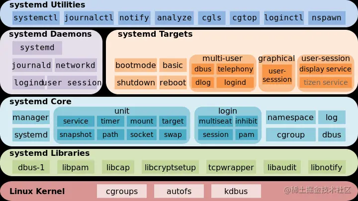 历史上,Linux的启动一直采用init进程,该方法启动时间长,且执行的启动脚本十分复杂。为了给系统启动和管理提供一套完善的解决方案,Lennart Poettering设计出了Systemd取代init。其功能十分强大,但体系也十分复杂。下图为Systemd的架构图: