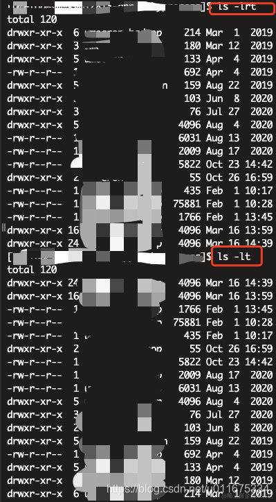 ls -lrt 表示按修改时间倒序列出当前工作目录下的文件。ls -l 表示按名称顺序正序列出当前工作目录下的文件。