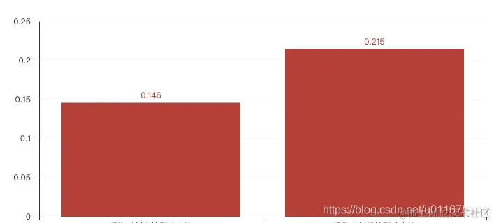 Pyecharts 调节柱状图中柱的宽度 程序媛三妹 2022-05-14 223 阅读1分钟 如上图所示,在只有两个柱的情况下,会按照默认值进行画图,个人觉得特别丑。 解决方法,加入如下字段: bar_category_gap = '80%' 本人使用 0.5 版本的 pyecharts,代码如下: bar.add("", columns, data, bar_category_gap = '80%', is_label_show = True) 效果图如下: 以上,问题解决。