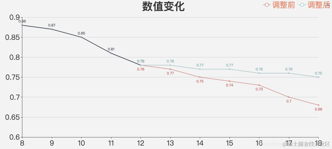line.add('调整后',columns,y4,is_label_show = True, yaxis_min = 0.5,mark_point_symbol='diamond',line_type = 'dashed')