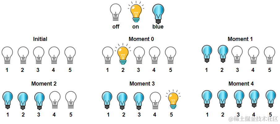 比如时刻2,首先应该有三个灯亮,其次应该是 1 2 3 号灯全亮,如果此时是 1 2 5 号灯亮,虽然也是亮着三个灯,但 5 号灯不是蓝色,不满足题意。
