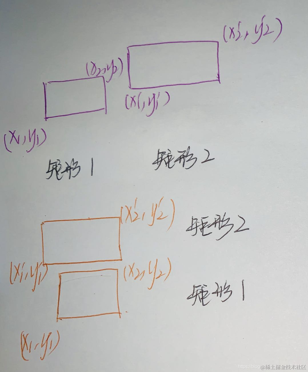 若直接思考发生重叠的情况,发现情况太多不易穷尽。所以逆向思维思考发现,只要找到两个矩形不重叠的情况排除即可。