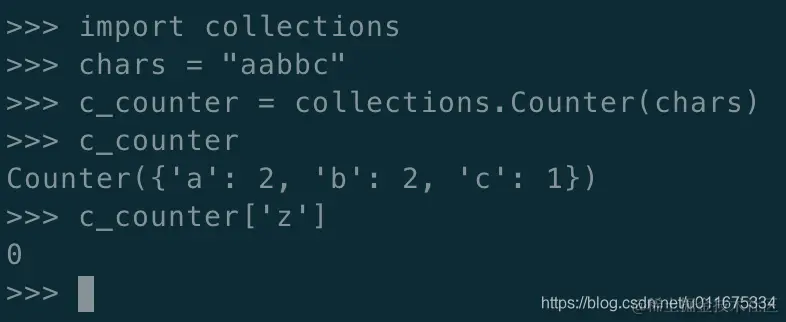 本题中主要用到了 collections.Counter() 用法,其比较巧妙的一点是:如果没有某个 key,则会默认这个 key 出现的个数为 0。示例如下: