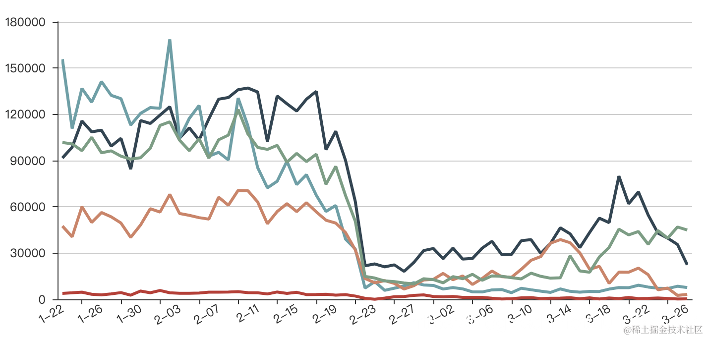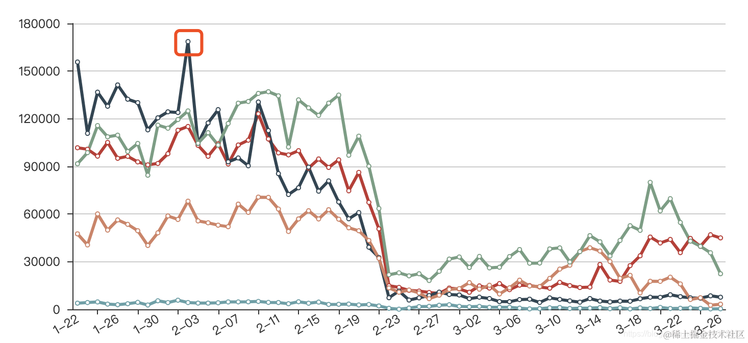 pyecharts 画折线图去掉折线上小圆圈 程序媛三妹 2022-05-14 219 阅读1分钟 如果想删除上图标记出来的小圆圈,变为如下形式: 只需在代码中加入 is_symbol_show = False 即可: line.add(country,date_column, _dict[country],line_width = 3,is_symbol_show = False,xaxis_rotate = 30,width=10000,xaxis_interval= 3) 以上,问题解决~