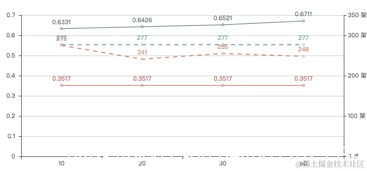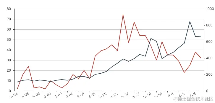 pyecharts 双Y轴默认网格线不一致如何解决 程序媛三妹 2022-05-14 451 阅读1分钟 双Y轴的图片常常会出现默认自带的网格线不重合的情况,如下图,我个人觉得非常丑: 所以我想到了两个比较 trick 的解决办法: 方法一: 一条 line 中加上 is_splitline_show = False 意思是把默认自带的网格线去掉,如下图: 方法二: 如果两个 Y 轴的刻度间隔数有希望能一致的话,则可以手动设置其中一个 Y 轴最大值来保证两个 Y 轴的间隔数一致——yaxis_max = 350,如下图: 以上,问题解决~