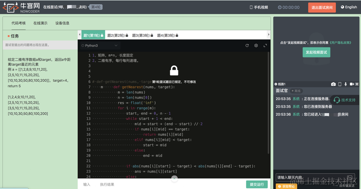 我第一次在牛客网链接上写代码,记忆中还是研究生毕业找工作期间各个公司都用牛客网做线上笔试的阴影,还要自己写输入输出啥的,总之跟 LeetCode 有一定差别,我也不想再去提前学习牛客网,此时已经面试疲了,就抱着死猪不怕开水烫的态度上场了。