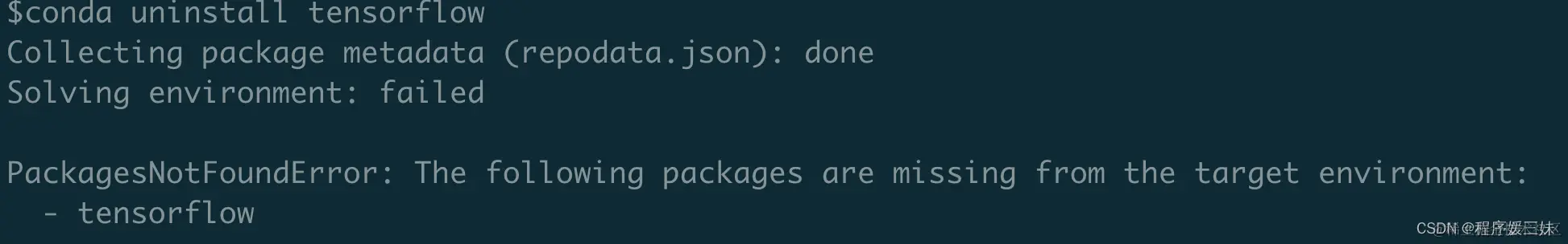 Conda 卸载包报错:PackagesNotFoundError: The following packages are missing from the target environment: 程序媛三妹 2022-05-14 1,408 阅读1分钟 一、完整报错 二、解决方法 使用pip 卸载 pip uninstall tensorflow 注意,pip 要使用该虚拟环境下的pip 以上,问题解决~