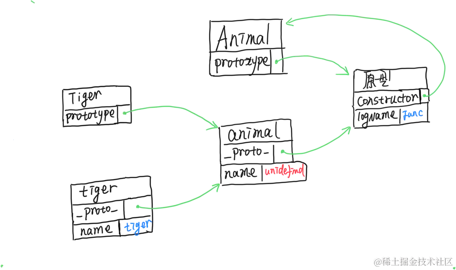 你发现没有,tiger对象的想要调用logName函数的时候,中间需要先查询animal对象,而不是直接查询animal的原型。我们可不可以跳过animal对象呢?emmm,答案当然是可以的,只要我们把tiger对象的__proto__直接指向animal的原型就好了
