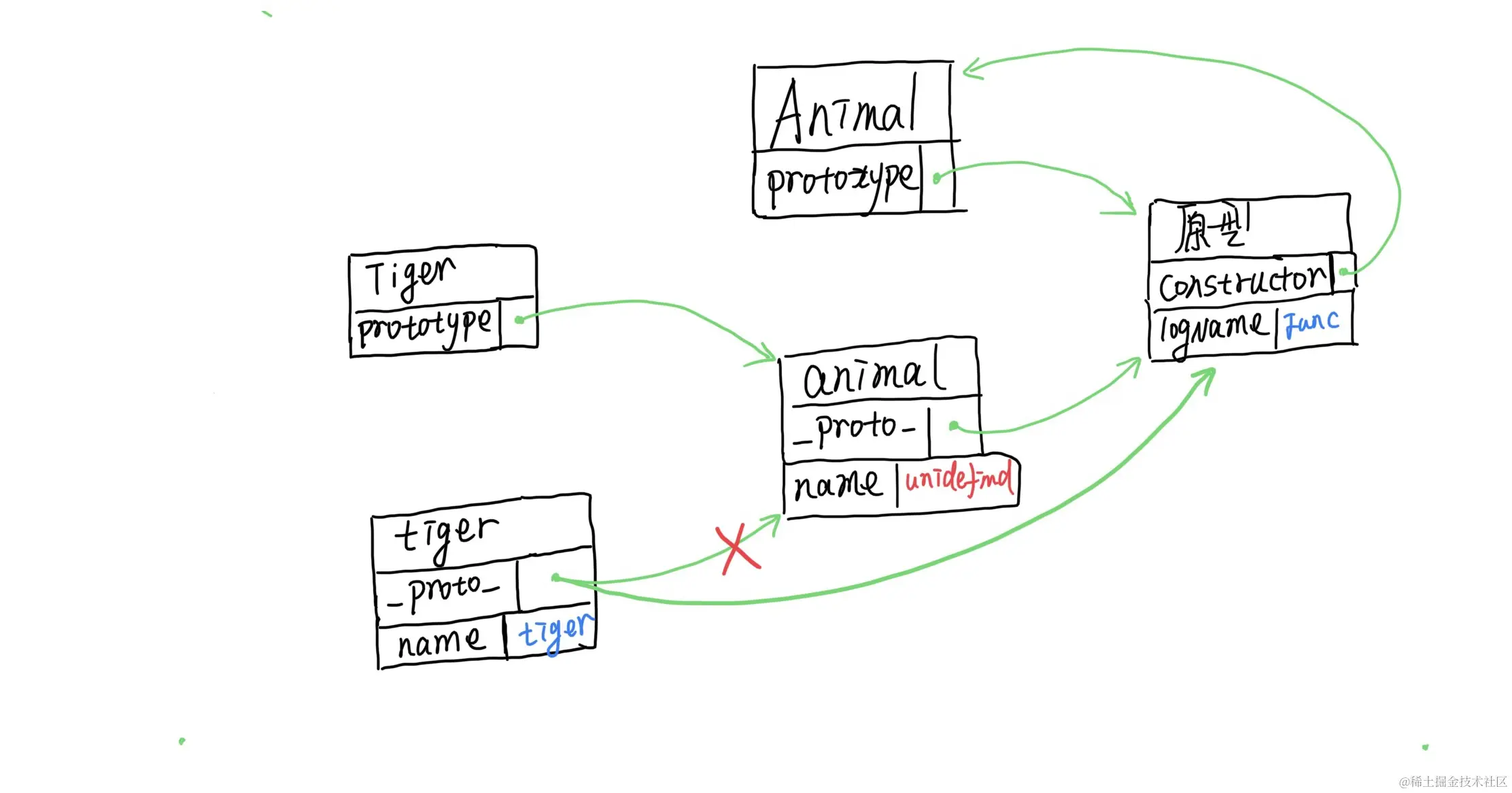 新创建了的littleTiger对象,它的__proto__是直接指向Animal.prototype的,没有掺杂任何的私货。