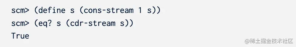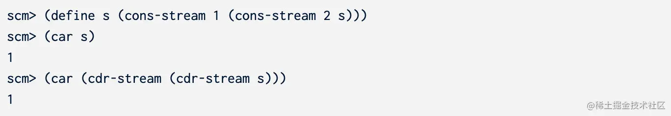 在scheme当中,stream是有可能存在环的,即stream当中的某个部分包含了自己本身: