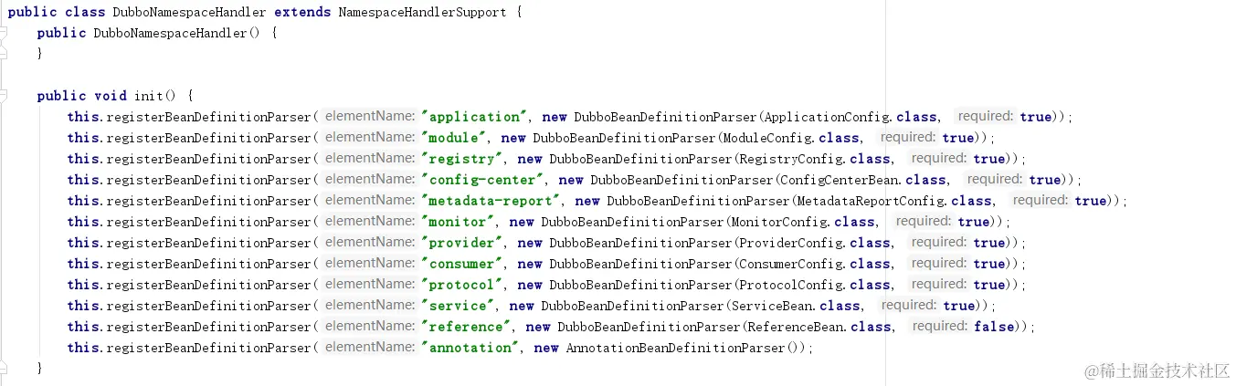 从这段源码中可以看到dubbo的自定义标签有10个,所有的标签都统一使用DubboBeanDefinitionParser进行解析,基于一对一属性映射,将XML标签解析为Bean对象。这里分析了dubbo框架中的对象加载配置与加载的原理,并做了一个demo帮助大家理解。后面继续分析dubbo消费者与生产者的原理与实现。