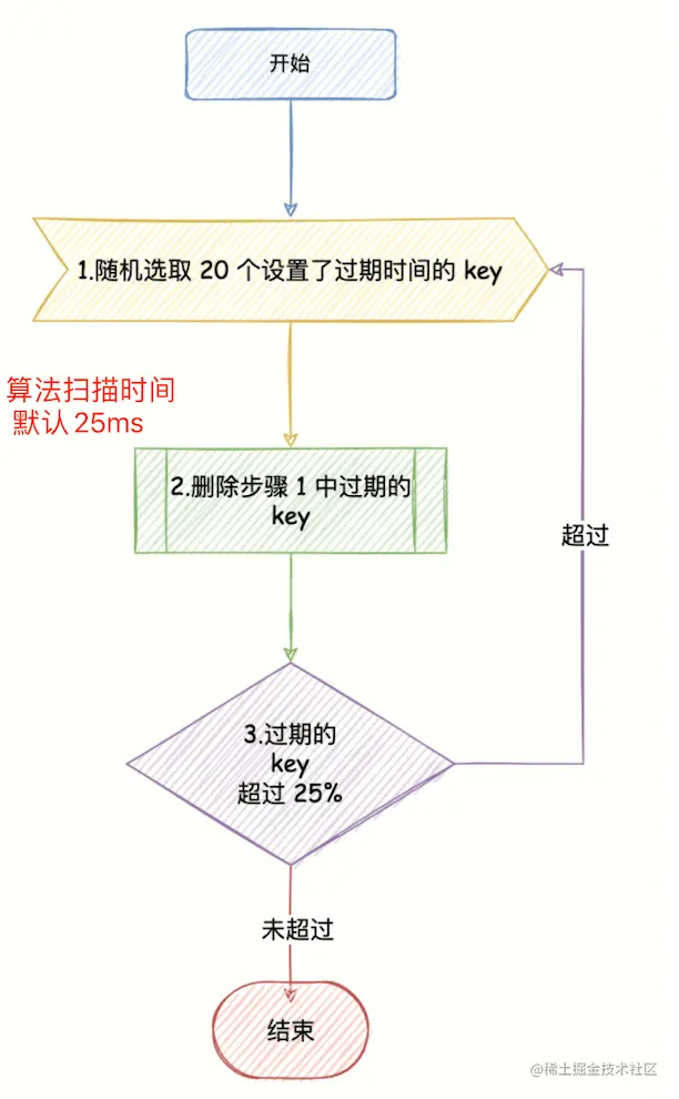 - 如果过期的 key 比率超过 25%,那就重复步骤 1;