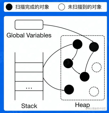 GC Root对象出发,扫描所有可达对象并标记为灰色,放入待处理队列