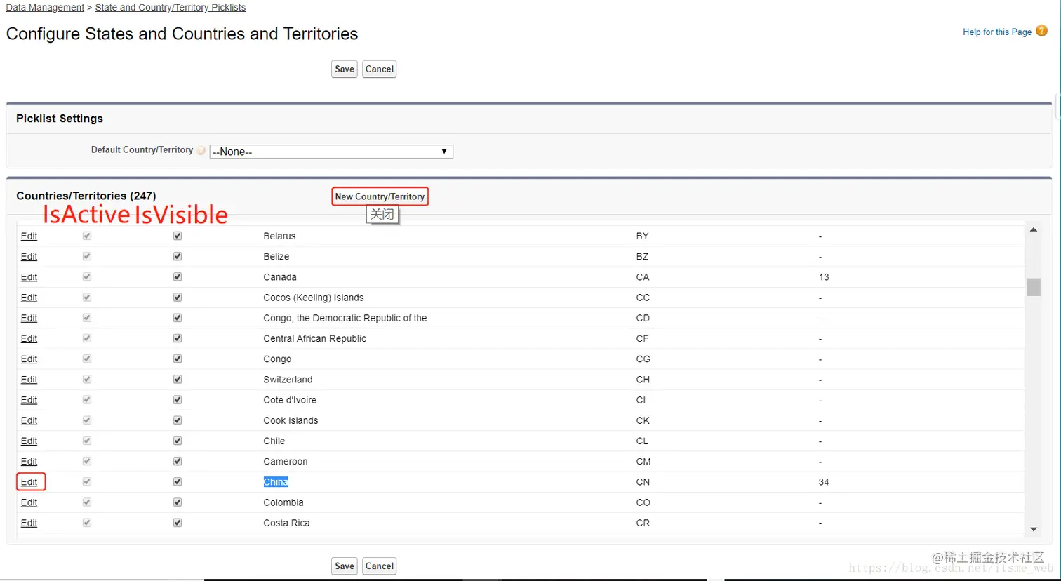 沉思的是:为什么China对应的State/Province这一级可选,而HongKong对应的State/Province是禁用的呢?又进一步的深思中国一般是省市区三级联动,现在只有国家和省可以联动,并不是很make sense呀?一般我们在进行地理区域的管理时都会新建对象来存储,如果你想使用partner community,10个自定义对象的限制绝对是硬伤,貌似这种方案选型的问题,并没有在新功能的问世而得到完美的解决。