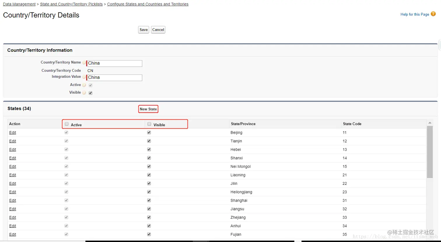 同样,我们可以编辑某个特定国家的State/Province,当新建了State/Province后,该记录就会被activate,我们可以通过控制Visible来控制该值是否在picklist列表里可见。
