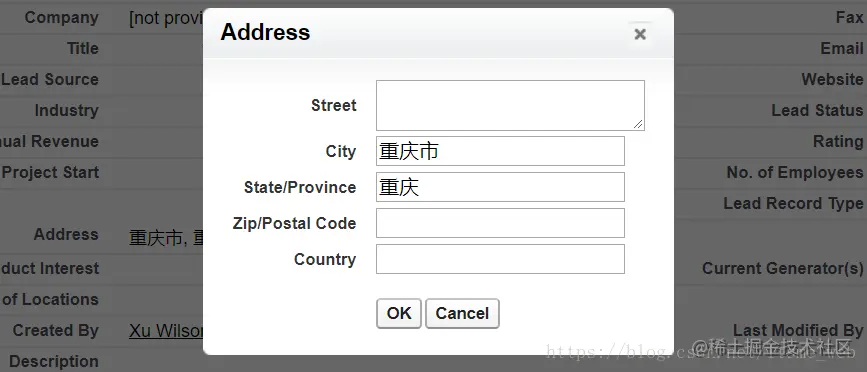 我们知道在部分标准对象(如:Lead)里Address字段是一个复合字段,它由Country,State/Province,City,PotalCode,Street等组成,我们之前看到它在编辑界面里是下图模样: