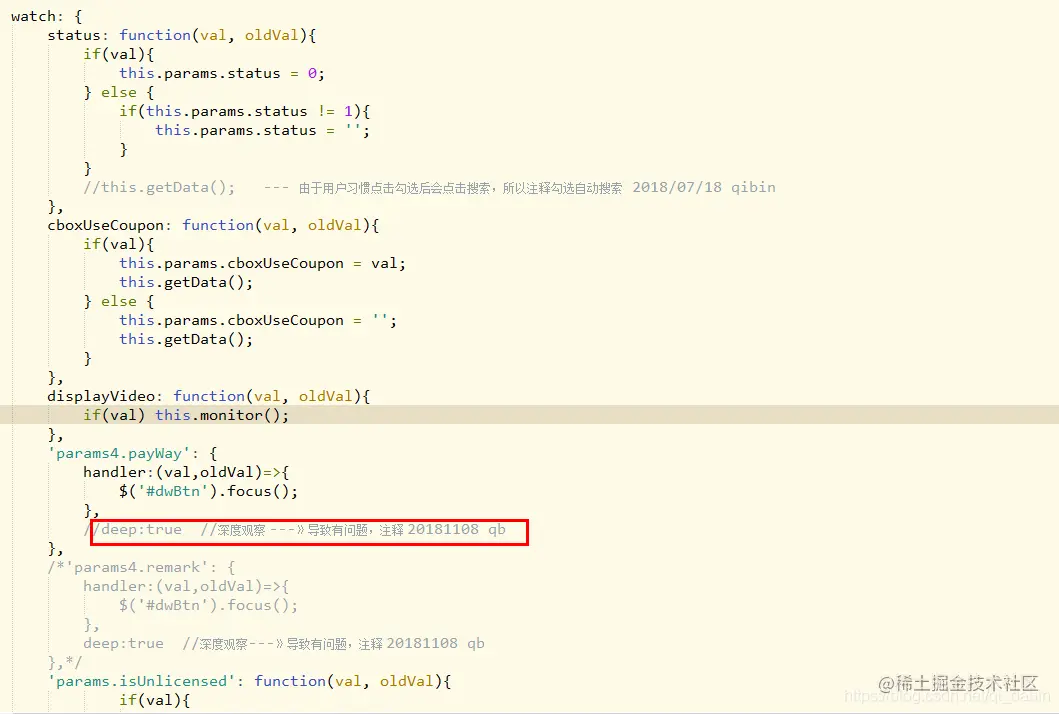 其实除了画红线的地方,别的都没什么,就是按照这个格式,上图中的status、cboxUseCoupon、displayVideo,包括params4.payWay都是页面中的全局参数,其中前面几个都是单值,可以直接这样监听,回调钩子里面有新的值和旧的值,当这些值改变的时候,就会进入到这个function中,需要注意画出来的那个注释,这也是我碰到的问题: