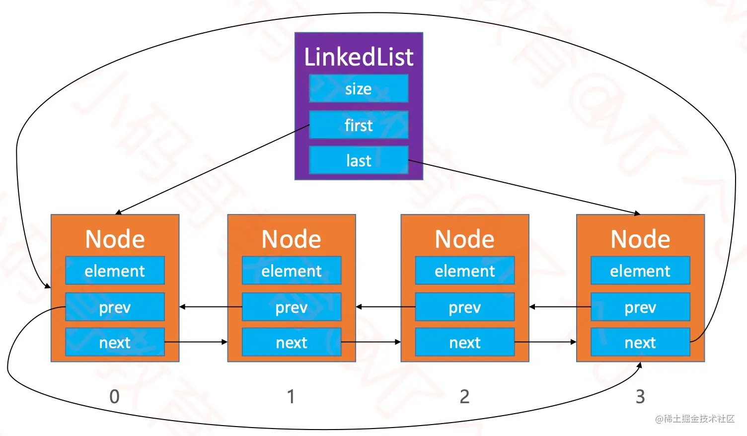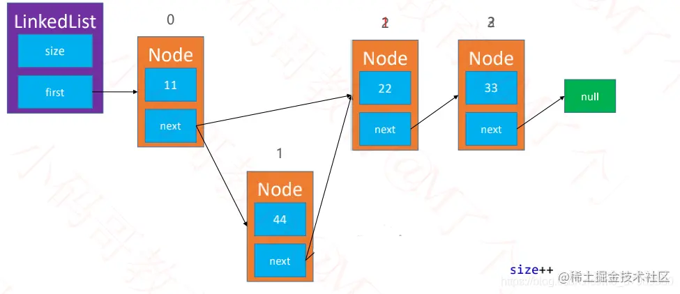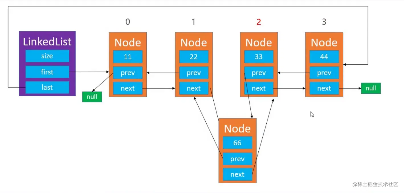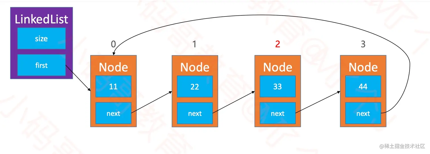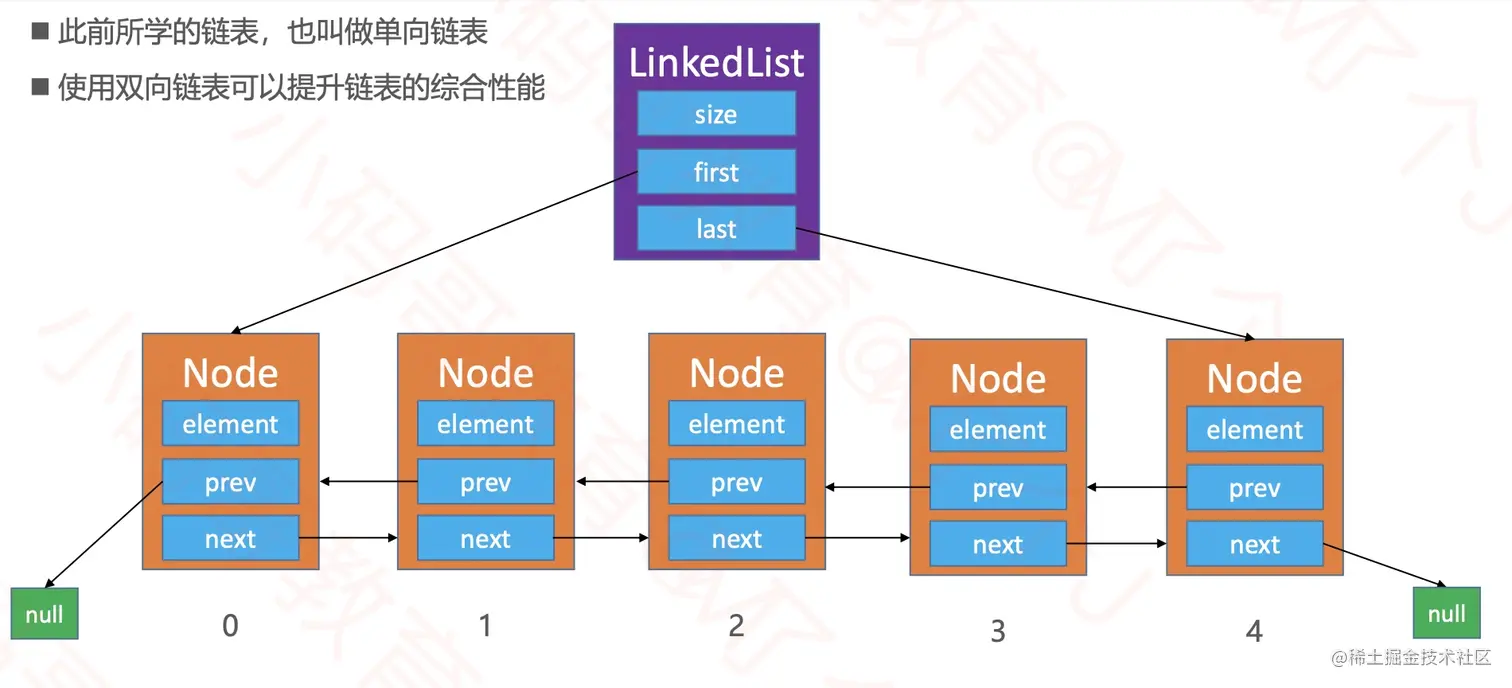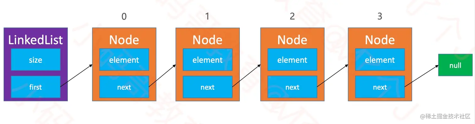Node,其中的element属性用于存储元素,next属性用于指向链表中的下一个节点。 - 其中的常用方法和动态数组基本一致