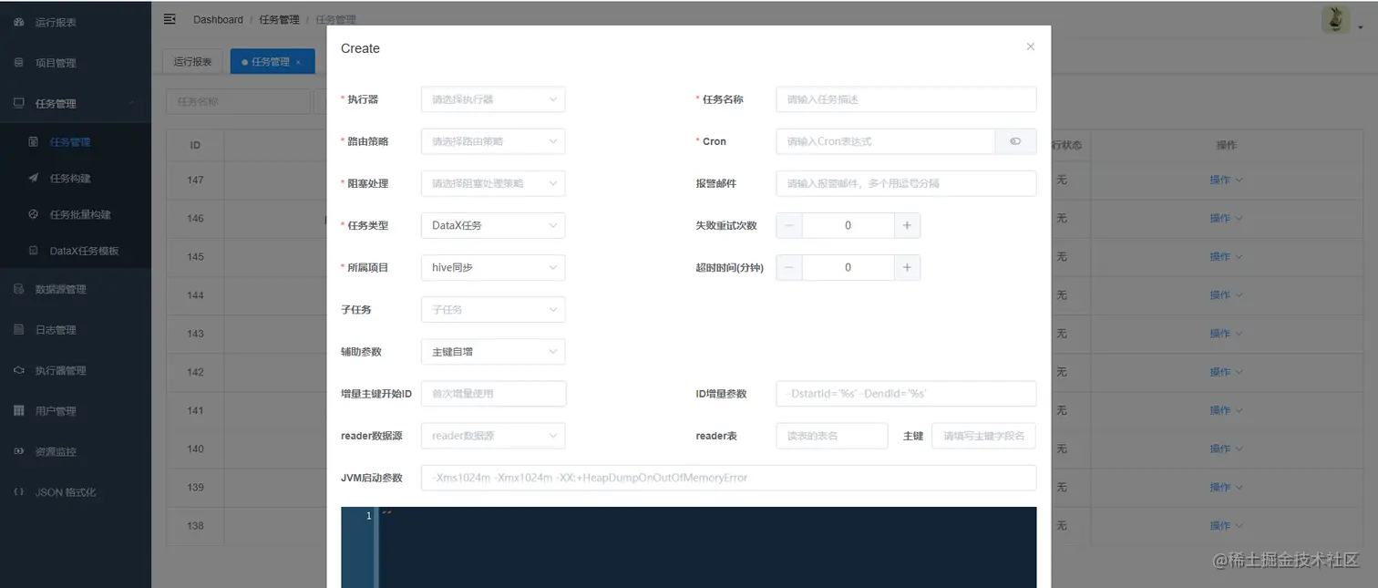 此时:可以选择复制json然后创建任务,选择datax任务,将json粘贴到文本框。