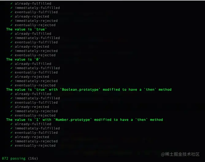 然后在项目目录中执行 promises-alpus-tests promise.js进行测试。当然我们也可以将命令直接配置到 package.json中去。