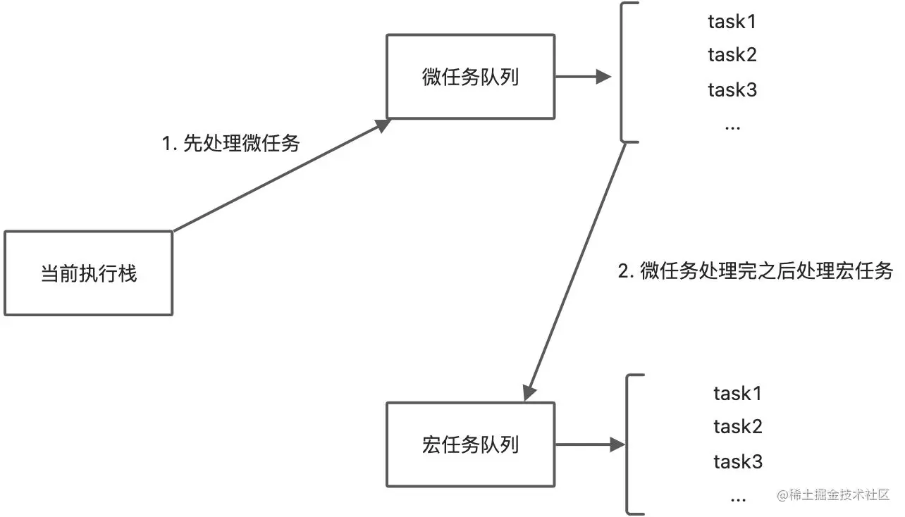如果当前的执行栈已经执行完同步的任务,那么主线程就会先查看微任务队列,如果队列中有任务则会执行队列中的任务直至清空队列;如果不存在,就会去查看宏任务队列,将其里面的事件按照顺序依次加入当前的执行栈中。这是一个循环往复的过程(事件循环 Event Loop)。
