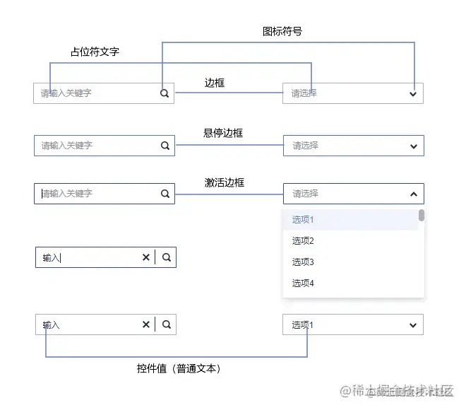 比如搜索框和下拉框,使用同样的变量控制相同部分的表现,使得组件在主题变化的可以使用相同的颜色规则。
