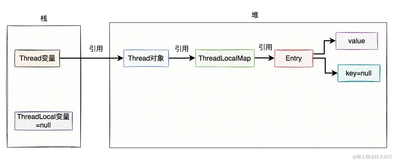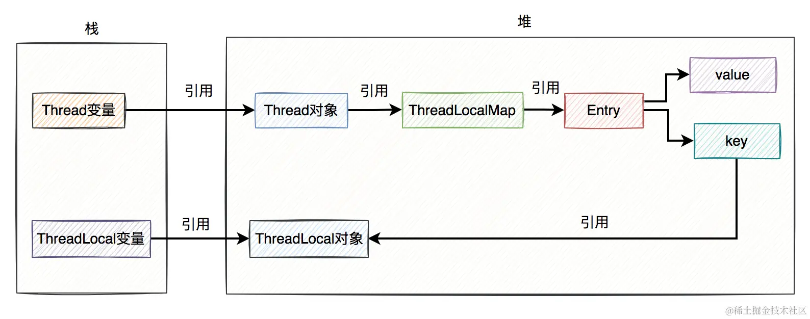 需要特别说明的是,上图中ThreadLocal对象我画到了堆上,其实在实际的业务场景中不一定在堆上。因为如果ThreadLocal被定义成了static的,ThreadLocal的对象是类共用的,可能出现在方法区。