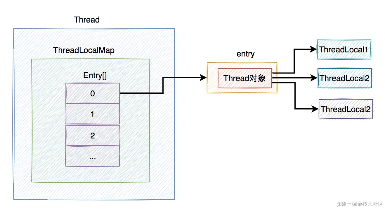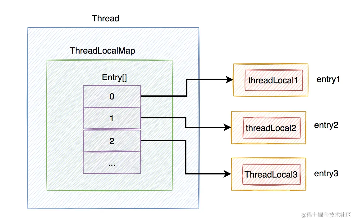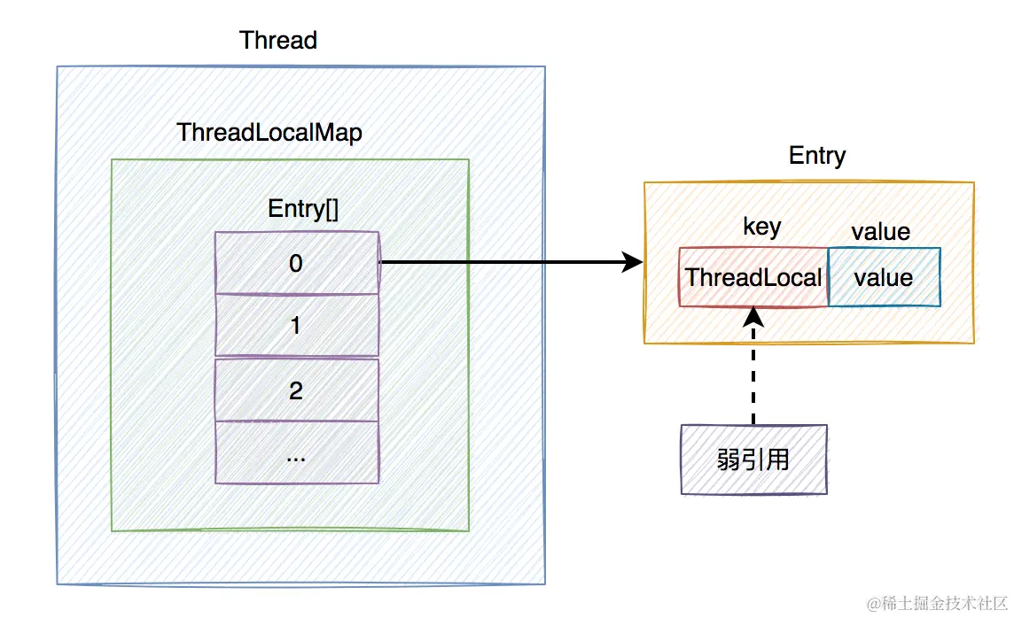 ThreadLocalMap内部还包含了一个Entry数组,其中:Entry = ThreadLocal + value。