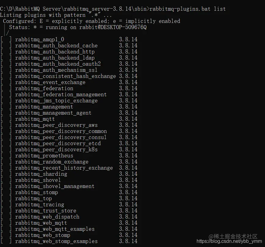 1、在cmd窗口下进入rabbitmq安装目录下的sbin目录,使用rabbitmq-plugins.bat list查看已安装的插件列表。